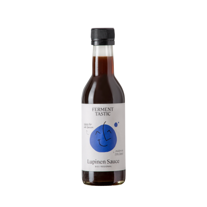 Die Bio Lupinen Sauce wird aus österreichischen Lupinen und aus österreichischem Malz hergestellt. Die Lupinen werden kurz angekeimt, gedämpft und mit dem Malz gemischt. Dann beginnt die Fermentation. Der Koji Pilz (Aspergillus oryzae) durchwächst das Malz-Lupinengemisch und produziert herzhafte Aminosäuren. Danach kommt das ganze zwölf Monate für eine zweite Fermentation in die Salzlake.